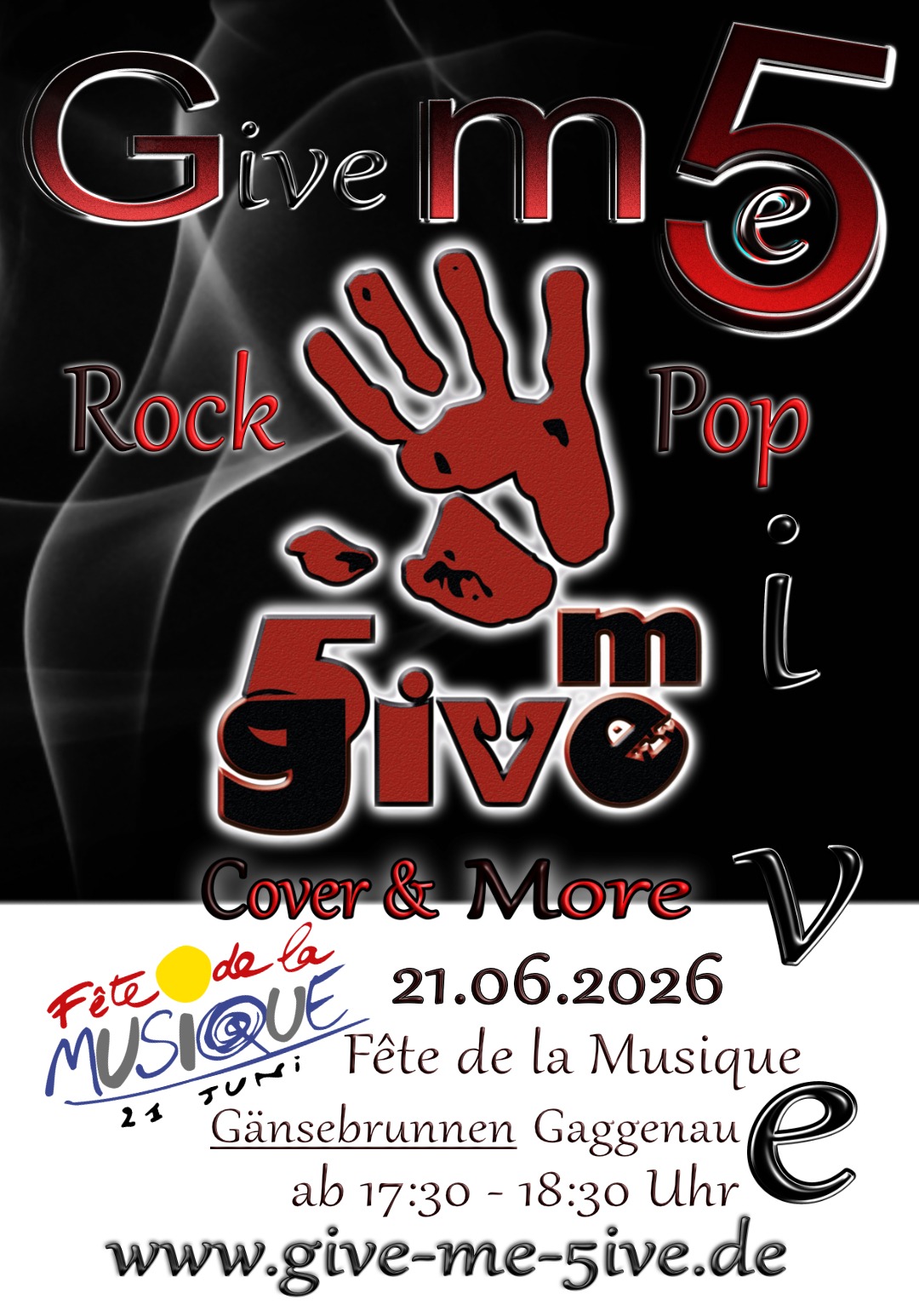 Am 21. Juni 2026 heißt es wieder: Musik erleben! Seid dabei, wenn GIVE ME 5IVE die Bühne beim Fête de la Musique in Gaggenau rockt! Wir bringen euch die besten Pop- und Rocksongs der letzten 40 Jahre – von zeitlosen Klassikern bis hin zu modernen Hits!